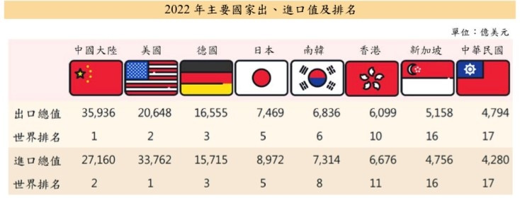 2022年台灣出口4794億美元、占1.9%,排名第17,滑落1名,主因阿拉伯聯合大公國因油價高漲帶動原油出口值大增,前進6名至第11。2022年全球前5大進口國則為美國、中國、德國、荷蘭及日本,台灣進口4280億美元、占全球1.7%,居第17名,與上年相同。