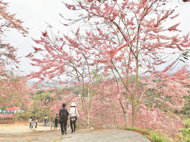 【記者江俊亮嘉義報導】嘉義縣竹崎鄉義隆村有個「阿拉伯粉紅村」,是由綽號「阿拉伯」的村長葉志紘以十一年時間、種植三千多株花旗木而得名,這些俗稱「泰國櫻花」的花旗木開花率超過五成,嘉義縣長翁章梁昨日主持開園活動,盛讚村長種樹救地球的「粉紅色浪漫」。