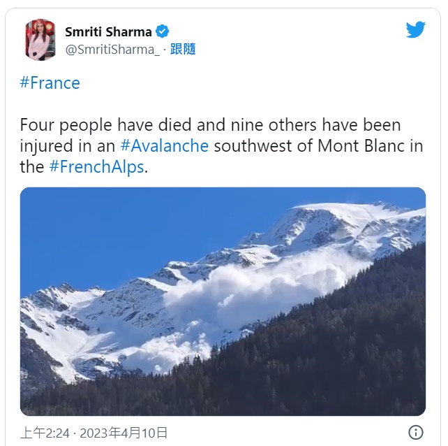 法國白朗峰驚傳「大規模雪崩」釀4死2失蹤。圖/ twitter@Smriti Sharma