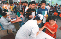 捐血送災區 民眾大排長龍 圖/本報香港傳真 |2008.05.15 語音朗讀 388觀看次 字級 大 中 小 中國大陸四川日前強力地震死傷慘重,各地區設有流動捐血車,好將捐來的血送往地震災區,許多民眾包括國外人士,都趕來捐血。北京電子科技學院也展開捐血救災活動,學生熱情高漲,圖為該院學生在學校飯堂裡踴躍獻血的情形。圖/本報香港傳真 前一篇文章 《醫療資訊》 下一篇文章 《健康講義》認識「發展遲緩」與「早期療育」 熱門新聞 01記得與忘記2026.01.0802悍將、雄鷹補戰力 拚闖季後賽2026.01.0903南投山區 梅花盛開2026.01.0704【愛的樣貌】平凡裡沉澱出深情2026.01.0605台水潮州營運所落成 佛光山灑淨2026.01.0906百馬剪紙 法水寺非遺藝術展2026.01.0607運動後分泌的肌肉激素是萬能荷爾蒙2026.01.1008全球最長壽貓 30歲等同120歲人瑞2026.01.0809星雲大師全集【傳記】百年佛緣─生活篇 僧情不比俗情濃—我對感情的看法 4 - 12026.01.0610星雲大師全集【傳記】百年佛緣─生活篇 僧情不比俗情濃—我對感情的看法 4-22026.01.07 訂閱電子報 台北市 天氣預報 台灣一週天氣預報 相關報導 短時間運動 或對腸癌細胞有潛在作用每周幫助人2至4小時 當義工延緩腦部老化藝人黃鐙輝 寒冬送暖弱勢常吃南瓜花椰菜藍莓 可緩解眼睛疲勞乾澀長者流感重症攀升 醫籲升級防護年紀增長腸胃變差 細嚼慢嚥避開油炸