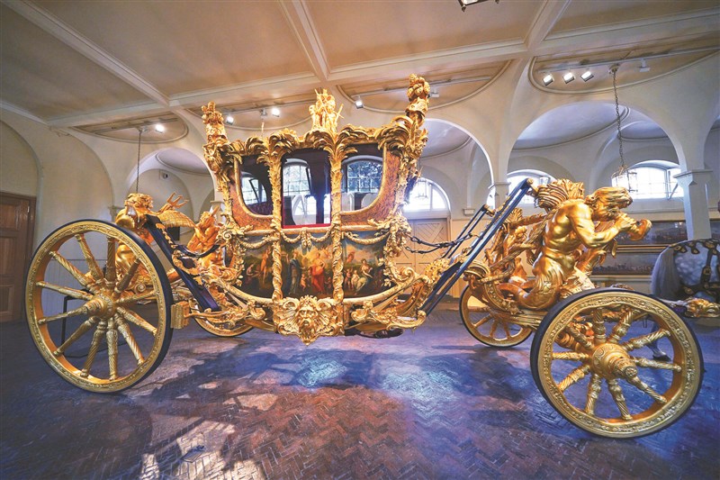 英國白金漢宮4日展出王室金馬車。英王查理三世與皇后卡蜜拉在5月加冕大典結束後,將搭乘王室金馬車返回白金漢宮。圖/美聯社