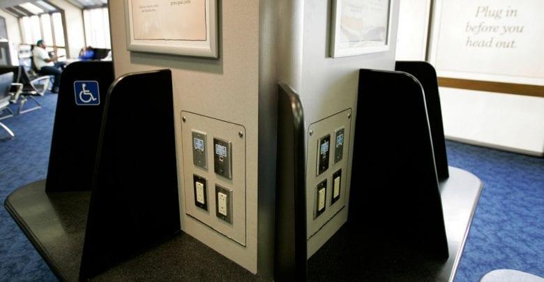 在機場使用公共的USB充電插座,個資恐遭竊。圖/美聯社
