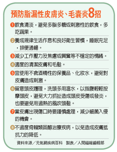 如何避免脂漏性皮膚炎、毛囊炎上身?蔡仁雨說,安全帽雖然不是導致皮膚炎的直接因素,但卻是「加重因素」,建議民眾減少熬夜的機會;安全帽的內襯可墊透氣的墊子,避免頭皮直接貼在帽子內又悶住,或選擇具有網狀透氣設計的安全帽;每天洗頭好好清潔,避免長期間配戴頭帽又未妥善清潔,頭皮容易發炎;定期清潔安全帽內襯,保持乾爽、潔淨。
