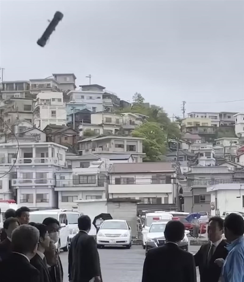 一名目擊者拍的影片清楚拍到圓筒狀爆裂物擲向岸田的畫面,以及岸田被快速撤離的畫面。