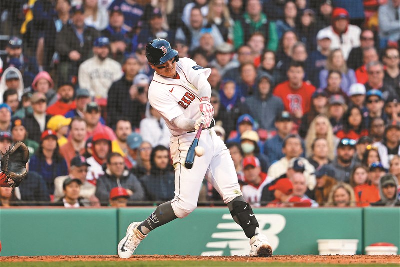 效力美職大聯盟波士頓紅襪隊的台灣好手張育成,第四局轟出兩分打點全壘打的瞬間。圖/法新社