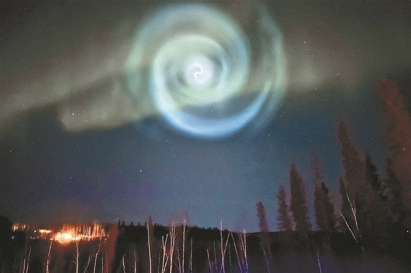 【本報綜合外電報導】美國太空公司SpaceX火箭「星艦」14日試發射後3小時,在阿拉斯加夜空竟出現颱風眼造型的光影與極光共舞的奇景,專家研判,奇景與「星艦」排放大量燃料有關。