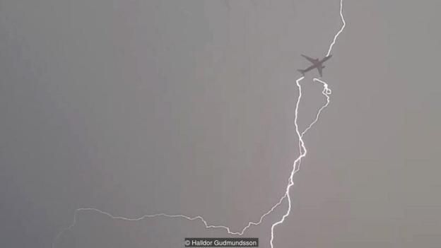 一架飛機從機場起飛,並立刻被一道閃電擊中。圖/BBC、Halldor Gudmundsson