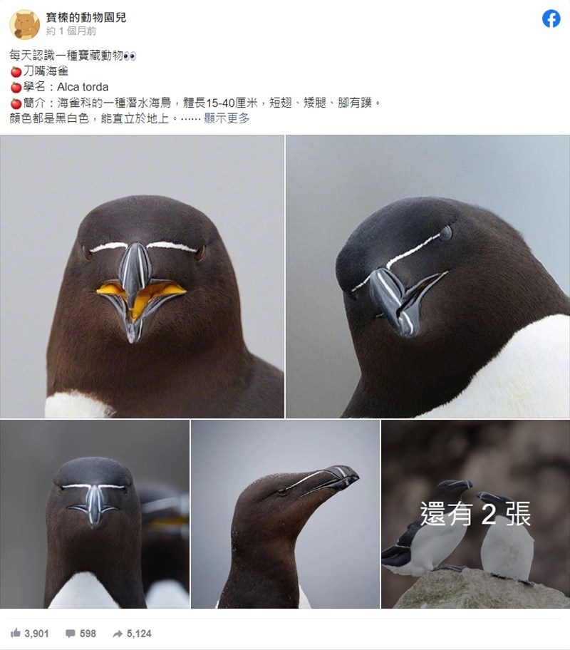 眼睛「一條白線」 網友驚:這鳥完全電影腳色 |2023.04.24 語音朗讀 3323觀看次 字級 大 中 小 長相奇特鳥類現身,正面看眼睛是只有一道白線,就像電影外星生命腳色一樣。圖/FB 寶榛的動物園兒 【本報綜合報導】真的是長相奇特的鳥類!網友分享一種黑頭白身的海雀,嘴巴上正中間有一道白線,乍看就像被立可白畫過一樣,但仔細看眼睛其實在旁邊。臉書粉專「寶榛的動物園兒」分享一種名為「刀嘴海雀」的鳥類,體色為黑白,是一種潛水海鳥,身長15~40公分,擁有短翅和短腿,腳有蹼,能夠直立在地上。刀嘴海雀分布於北極、亞北極及溫帶北部地區,少數種向南至下加利福尼亞半島,以魚、甲殼類、軟體動物和浮游生物為食。圖/FB 寶榛的動物園兒這種刀嘴整顆頭都是黑色,不仔細看容易忽略眼睛,雙眼中間有一道白線紋路,乍看很像是眼睛被修正液畫到或封住,從側面看就能明顯看到雙眼所在,甚至可以感覺出有些帥氣。網友笑:「很難不以為白白的是眼睛」、「好未來感的長相」、「像戴上滑稽面具的鳥」、「感覺要會射出雷射光」、「根本就是電影星戰腳色」、「側臉超帥阿,正面也太有喜感」、「曼達洛人」。 前一篇文章 全球黑面琵鷺6603隻創新高 台灣占64% 下一篇文章 循環杯成效不佳 6成民眾憂心「1原因」不願嘗試 熱門新聞 01【閃文集】 駝峰天使2025.11.0402台中新社花海 重現經典卡通2025.11.0603WTA、ATP年終賽 獎金創新高2025.11.0704佛光佈教師、友愛服務隊 精進行佛2025.11.0605《365日》贈嘉義香湖國際大飯店 佛光人結書香善緣2025.11.0606星雲大師全集【傳記】百年佛緣─生活篇 我的衣食住行 5 - 22025.11.0407星雲大師全集【傳記】百年佛緣─生活篇 我的衣食住行 5 - 32025.11.0508腸道是人體第二大腦 影響情緒睡眠免疫力2025.11.0409山本由伸 拚美職首座賽揚獎2025.11.0510古老金幣2025.11.05 訂閱電子報 台北市 天氣預報 台灣一週天氣預報 相關報導 日月潭沒降雨蓄水率增加 水力發電助攻屏東書院園區公告 不能再亂餵鳥類及野生動物 尊重原民文化 七彩湖擬畫保護區盼善意對待海洋 屏東再啟動回收廢漁網計畫要維護生態 丹大地區劃設保護區桃園市復興區櫻花開 罕見「藍喉太陽鳥」現身
