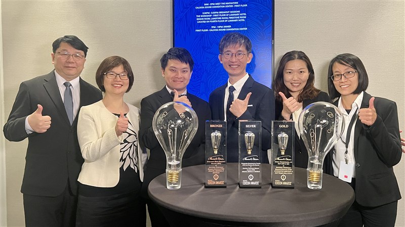工研院勇奪2023愛迪生獎(Edison Awards)於21日在美領獎。左起為工研院北美辦公室主任王明哲、工研院生醫與醫材研究所副所長呂瑞梅、工研院資訊與通訊研究所工程師陳柏瑋、工研院資訊與通訊研究所組長廖彥彰、工研院生醫與醫材研究所副組長鄭淑珍、工研院生醫與醫材研究所專案經理李若屏。