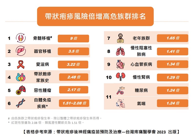 中華民國免疫學會副理事長、台中榮民總醫院風溼免疫科陳怡行醫師指出,免疫力低下族群如糖尿病、腎臟病、氣喘、癌症等患者,發生帶狀疱疹機率更是一般人的1.24-9倍,且疱疹後神經痛機率更高,感染危機如影隨形,不可不防。