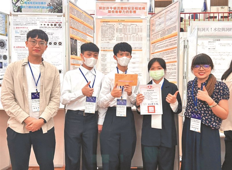 「探討非牛頓流體對安全帽結構吸收衝擊力的影響」隊長趙家亨分享,老師李淑鈴帶領他們利用玉米粉摻水做為流體,以強化安全帽保護頭部的材質,發現非牛頓流體,有助降低外力對安全帽的衝擊,盼守護機車族。
