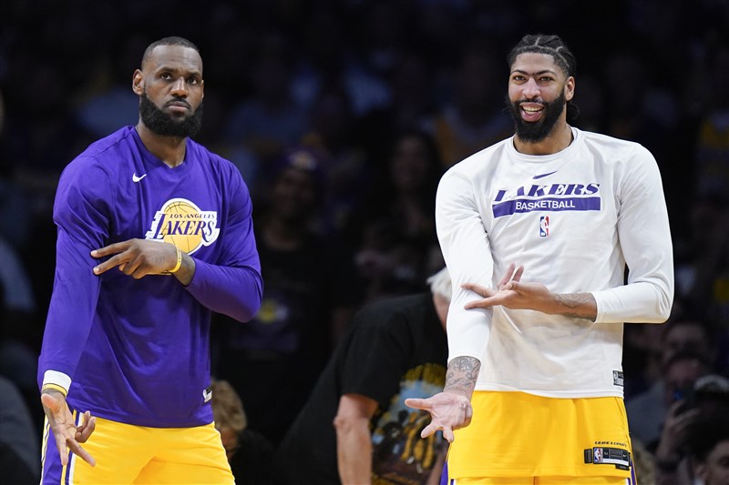 詹皇(左)與戴維斯(右)打完前3節就早早幫湖人奠定勝基在場下當觀眾。圖/美聯社