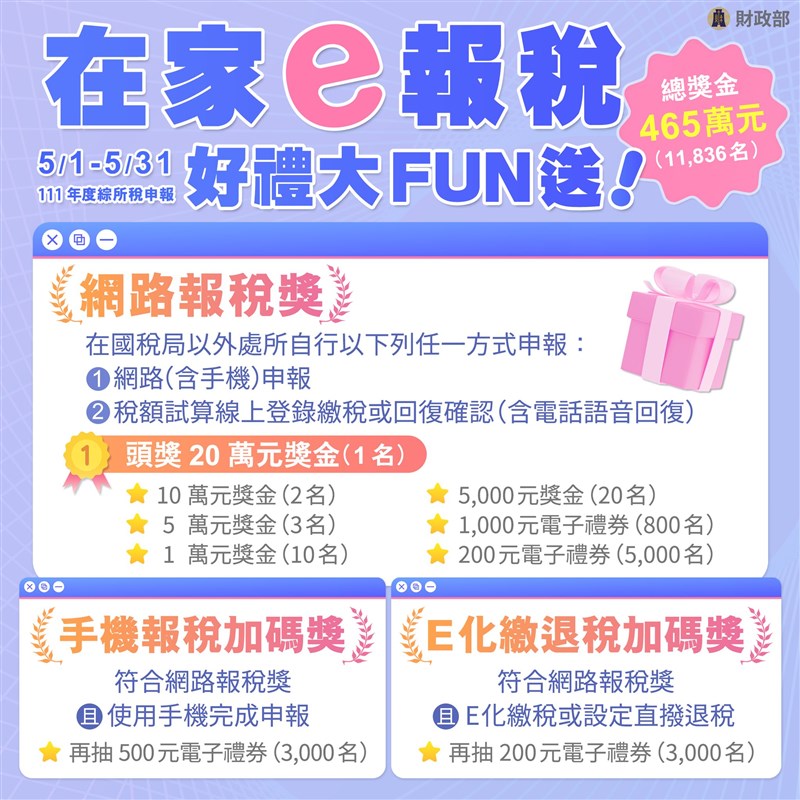 報稅季將開跑 教戰守則報你知 |2023.04.29 語音朗讀 2164觀看次 字級 大 中 小 今年報稅季將開始,各項報稅時程、措施,教戰守則一次報你知。圖/資料照片 【本報台北訊】報稅季5月1日開跑,綜合所得稅申報期限至5月31日,基本生活費調升等減稅利多齊發,逾640萬申報戶有感;同時,手機報稅3.0新增現金繳納、申請延分期,網路申報試辦附件上傳功能,還可參加抽獎、總獎金465萬元,首批退稅對象也略微調整;各項報稅時程、措施,教戰守則一次報你知。綜所稅申報鳴槍 掌握5大關鍵時間一、考量今年新冠疫情趨緩、防疫措施鬆綁,報稅季維持法定的1個月期間,也就是自5月1日至5月31日。民眾若受疫情影響,無法於申報期內一次繳清稅款,可申請延期繳納、期限最長1年,或是分期繳納、最多分3年。二、由於今年申報期限至5月底,所得及扣除額資料查調期間為4月28日至5月31日止。三、為便利民眾報稅,國稅局將於5月1、25、26日,及29至31日中午加班收件,其中,報稅截止當日將延長開門至晚上7時;申報期間其餘正常上班日中午,各地區國稅局將視納稅義務人臨櫃申報及查詢所得、扣除額情形,彈性調整加班時間。四、綜所稅網路申報應檢附資料送交時間,民眾須於6月12日前寄、送至就近國稅局,或5月31日前,經由綜所稅電子結算申報繳稅系統,連結至附件上傳系統,透過網路傳送。圖/取自中華民國財政部臉書五、今年第1批退稅時間落在7月31日,對象包含5月31日前採網路申報者(含手機報稅);5月31日前以稅額試算服務線上登錄或電話語音回復確認案件;5月10日前向戶籍所在地國稅局,以稅額試算服務紙本回復的退稅案件。值得注意的是,往年民眾在5月10日前,採用二維條碼及人工申報向「戶籍所在地」國稅局的分局、稽徵所完成申報者,可列為第1批退稅。自今年起,為推廣網路申報,採用上述2類申報退稅的案件,一律列為第2批退稅範圍,也就是10月31日領到退稅款。適用第二批退稅者也包含5月10日前以人工、二維條碼和稅額試算紙本回復,向「非戶籍地」國稅局申報的案件;5月11日之後以人工、二維條碼和稅額試算紙本回復,向「各地區」國稅局申報的案件。此外,第3批退稅時間落在2024年1月19日。基本生活費調升至19.6萬 免稅額、標扣額等齊拉高今年5月申報去年所得,財政部指出,除基本生活費調升至新台幣19.6萬元,預估230萬申報戶受惠。同時,免稅額、標準扣除額、薪資所得特別扣除額、身心障礙特別扣除額分別調高4000元到8000元不等;稅率級距、計算退職所得定額免稅的金額也有所變動,預估約641萬申報戶將有感省稅。手機報稅3.0功能堪比電腦版為讓更多族群適用手機報稅,今年手機報稅3.0新增現金繳稅、申請延分期繳稅,同時,網路申報(含電腦、手機)試辦附件上傳。詳情可參考財政部財政資訊中心的影片。財政部表示,附件上傳資料全程加密保護,同時提醒民眾,原始資料需保存7年以供國稅局日後查考。圖/取自中華民國財政部臉書網路宅報稅抽獎 總獎金達465萬元今年各地區國稅局聯合舉辦「在家e報稅 好禮大Fun送」抽獎活動,現金加上電子禮券總獎金達465萬元,最大獎為現金20萬元。民眾於申報期間,自行在國稅局以外處所,完成網路申報(含手機報稅),或稅額試算案件採線上回復(含語音回復)確認,或線上登錄繳稅者,即可參加抽獎。為鼓勵民眾採手機報稅、使用E化方式繳納稅款,或設定金融機構帳戶辦理直撥退稅,符合上述條件的納稅義務人,還可參加「手機報稅加碼獎」及「E化繳退稅加碼獎」抽獎。財政部表示,8月下旬將以電腦程式隨機公開抽出1萬1836位幸運兒,相關簡訊將傳送至111年度綜所稅申報資料留存的手機號碼,由得獎人自行完成兌領,特別提醒民眾報稅時記得留下手機號碼。圖/取自中華民國財政部臉書 前一篇文章 NBA/狂贏灰熊40分 湖人晉級寫詹皇帶隊歷史 下一篇文章 又有新型詐騙手法 繳費通知簡訊要看清楚 熱門新聞 01北美最乾燥加州死谷 罕見繁花錦簇2026.03.1802大馬急轉彎 撤回美對等貿易協議無效說 2026.03.1803店貓上班摸魚睡翻 萌樣逗樂網友2026.03.1804【歷史點滴】走過百年 高雄橋頭糖廠2026.03.1805【大江南北】哈爾濱呼蘭天主教堂2026.03.1806【分享時刻】某些愛2026.03.1807地下1118公尺礦坑跑馬拉松 刷新2紀錄2026.03.1808瑞士佛光山灑淨 祈願道場重建順利2026.03.1809美海軍引進機器人 爬牆維修艦艇2026.03.1910黃仁勳推輝達版龍蝦 進軍太空2026.03.18 訂閱電子報 台北市 天氣預報 台灣一週天氣預報 相關報導 李貞秀與2白委聯合質詢 邱垂正間接備詢汽油漲1.8元 卓揆:政府吸收13.2元盧秀燕出訪 藍:有助化解疑美論總統登海鯤號 防長:不設定交艦時程考績法 擬取消甲乙丙丁等藍白拍板 聯合競選治理方向