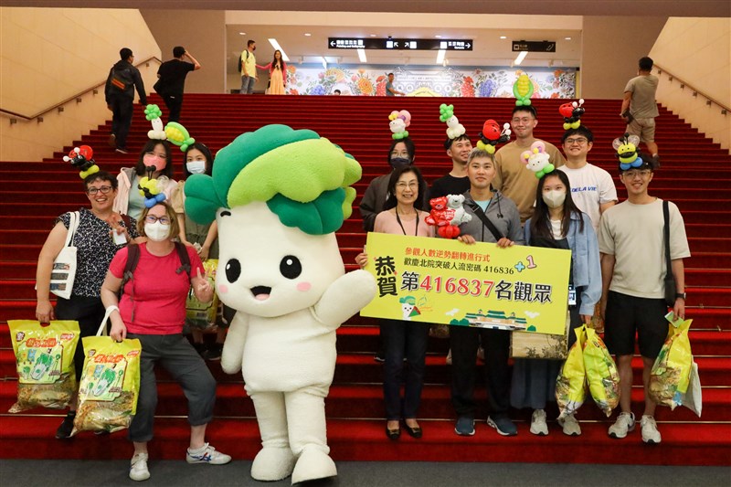 故宮今天除了報喜今年度參觀人數已破2021年全年人數,特別致贈第416837名及前後各5名旅客包含「梵蒂岡宗座圖書館珍藏」特展圖錄、翠玉白菜USB以及樂事X故宮聯名洋芋片等豐富大禮包,祝福來訪旅客皆平安健康。