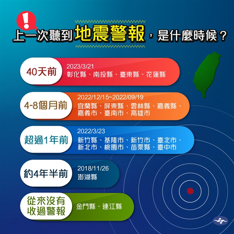 地震警報最常響縣市是這裡 這2地居民未聽過 |2023.04.30 語音朗讀 980觀看次 字級 大 中 小 「報地震 - 中央氣象局」臉書粉專表示,各地區對警報的熟悉程度卻差很多,澎湖縣民眾超過4年沒有聽到震耳欲聾的警報聲了,至於金門縣、連江縣從來沒有響過警報。圖/劉學聖 【本報台北訊】你還記得上一次收到地震的國家級警報是什麼時候嗎?「報地震 - 中央氣象局」臉書粉專表示,明明都是台灣人,各地區對警報的熟悉程度卻差很多,西北部民眾真的很少聽到警報,澎湖縣民眾也超過4年沒有聽到震耳欲聾的警報聲了,至於金門縣、連江縣從來沒有響過警報。「報地震 - 中央氣象局」說,台灣位處於板塊交界帶,地震頻繁,中央氣象局致力於開發地震預警系統,希望可以在地震波抵達各處之前,提早警示大家盡速避難。為了避免中小型地震、無嚴重致災風險的告警訊息造成民眾困擾,氣象局訂定了兩個發布條件,預估地震規模5.0以上、預估震度達4級以上。圖/報地震 - 中央氣象局 FB「報地震 - 中央氣象局」說,由此可知,即使某次地震預估規模5.0以上,但所在地區預估震度未達4級的話,還是收不到。台灣本島最近一次地震警報,是3月21日針對彰化縣、南投縣、台東縣、花蓮縣發布地震速報;至於澎湖縣上一次地震警報是2018年11月26日、約4年半前,金門縣、連江縣從來沒有收過警報。2022年國家級警報發布數量的縣市排名,前3名依序是台東縣20次、花蓮縣17次、嘉義縣11次。圖/報地震 - 中央氣象局 FB 前一篇文章 兒童墜樓意外頻傳 醫籲加裝隱形鐵窗防護 下一篇文章 勞動節連假第2天 國5一早湧車潮 熱門新聞 01南投太極美地空中纜車 下半年動工2026.03.2202【轉角風景】幽靜觀賞 三色寒櫻2026.03.2203【詩】白花鬼2026.03.2504鑲嵌藝術2026.03.2305故宮特展神獸再現 麒麟、鳳凰登場 2026.03.2406南華大學茶禪雅集 靜坐書寫時光膠囊2026.03.2607星雲大師靈骨分燈北美 法脈永傳2026.03.2408楊筑云、林芷均 奧爾良羽賽獲亞軍2026.03.2309中南部水庫水位告急 各地農損頻傳2026.03.2410星雲大師靈骨分燈歐洲 傳燈萬方2026.03.26 訂閱電子報 台北市 天氣預報 台灣一週天氣預報 相關報導 能源漲價 央行逐季檢視通膨京華城案 柯文哲重判17年台東實彈操演 美技術人員在場非核轉彎 卓:反核非神主牌李貞秀與2白委聯合質詢 邱垂正間接備詢汽油漲1.8元 卓揆:政府吸收13.2元