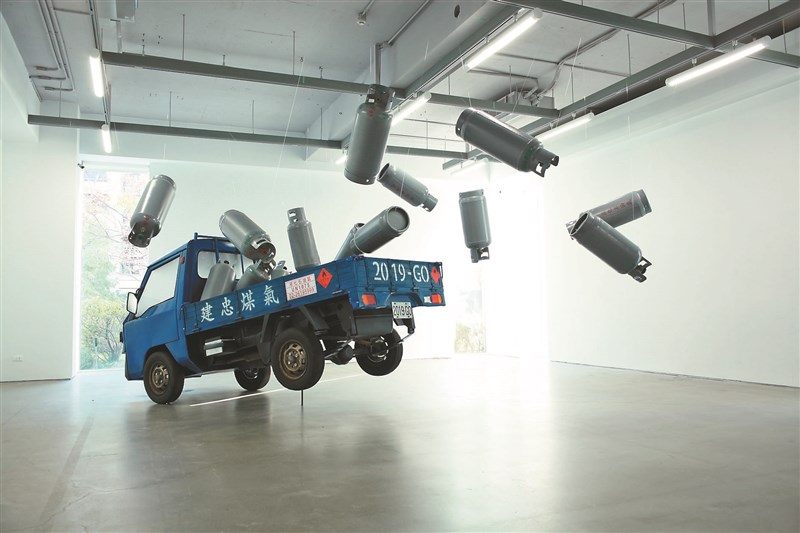 台灣藝術家廖建忠作品〈載瓦斯的小發財〉,讓沉重的瓦斯桶與小卡車,如失去重力般飛躍起來。圖/廖建忠提供