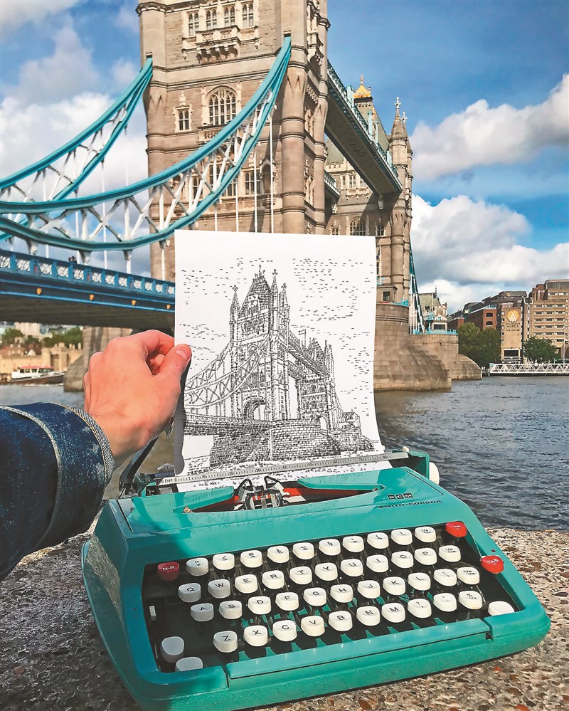 英國藝術家詹姆斯.庫克擅長以打字機創作,圖為作品〈塔橋再現〉。