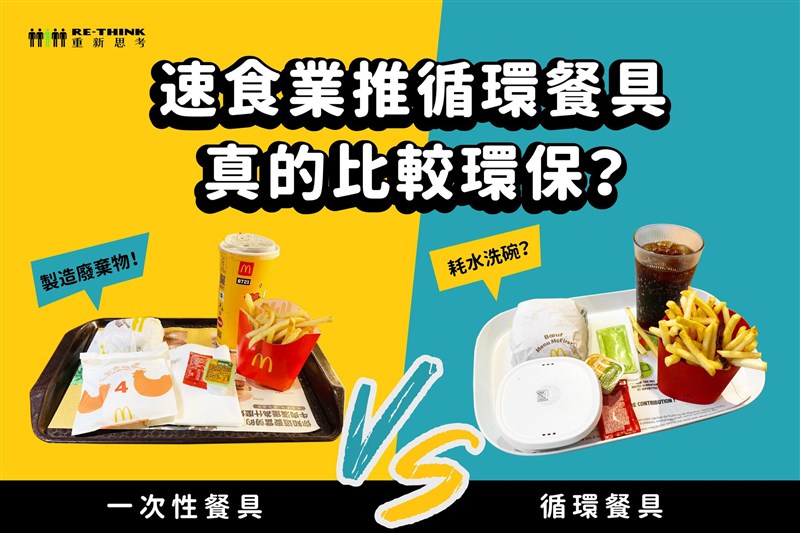 RE-THINK表示,比較台灣麥當勞的一次性餐具及法國麥當勞使用的環保容器,一次性餐具只需考慮製造到廢棄的過程,而循環容器則要考量每次清洗時對環境的影響。