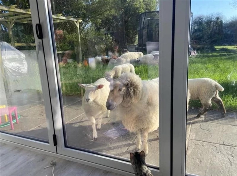 費雪看到這畫面簡直嚇壞了,她從未想過自己家裡有一天會這樣被「免費除草工」塞滿滿,她就這樣跟自己的家人一邊在餐廳吃飯一邊觀察羊群們,連費雪的愛貓遇到這種狀況也好奇心大起,趴在玻璃窗上緊盯羊群不肯離去,有幾隻羊就像是沒吃飽一樣,吃完草還跑到窗前要求加菜。