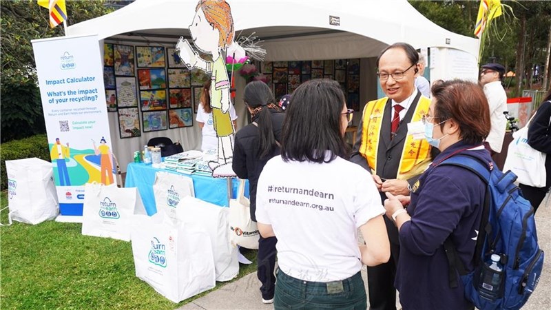 Buddha's Light International Association (BLIA) Sydney Chapter West Branch 1 collaborated with Return and Earn and Permaculture Sydney West to promote environmental sustainability at the 2023 multicultural celebration of Buddha's Birthday. The event was held at Tumbalong Park in Darling Harbour from April 22nd to 23rd, and BLIA participated in the booth of "Environmental and Spiritual Preservation, Sustainable Development."