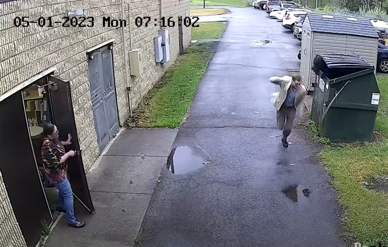 一名小學校長準備打開垃圾箱,箱子裡突然竄出巨大黑熊,嚇得校長落荒而逃。 圖/Youtube WSAZ NewsChannel 3