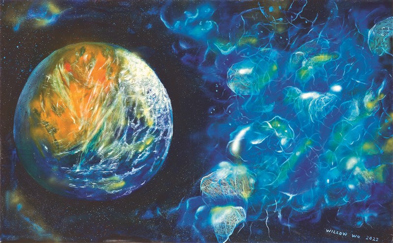 「台灣五月畫會67周年會員聯展」即日至17日在中正紀念堂展出,共展出40餘件作品,除了第一屆藝術家鄭瓊娟、陳景容,也特別邀請台灣抽象畫教父陳正雄、藝術評論家王哲雄、超現實詩象畫家陳顯棟、主持人白嘉莉等人參展。圖為吳柳畫作〈脆弱的星球〉。圖/五月畫會提供