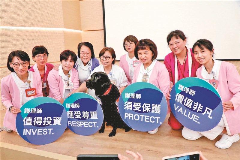 台北榮總護理團隊,與由導盲犬「轉職」治療犬的Oba(中)合影。