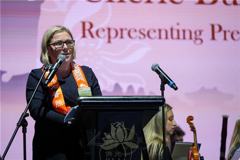 Ms. Cherie Ann Burton, former member of the NSW Legislative Assembly, delivered a speech on behalf of the New South Wales Governor. She stated that Venerable Master Hsing Yun has established over 300 temples and 5 universities worldwide, and his determination and achievements are admirable. She also believes that Humanistic Buddhism can bring peace to Australia and the world.