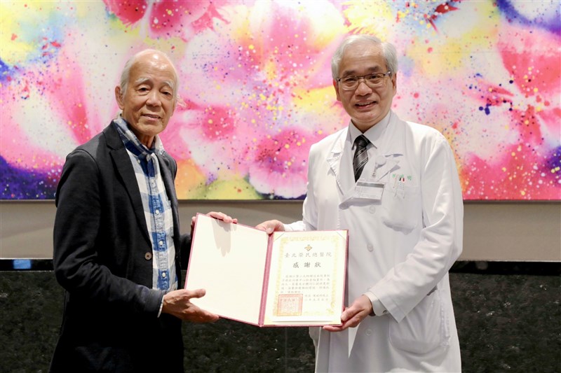 陳威明院長(右)感謝知名畫家江賢二(左)贈畫,鼓舞病人、撫慰人心。圖/北榮提供
