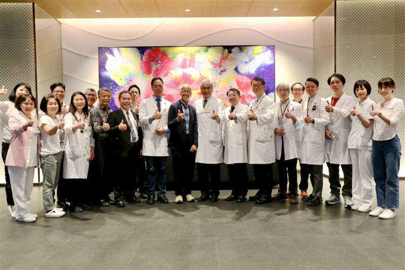 畫家江賢二(中)與陳威明院長及重粒子癌症治療中心同仁合影。圖/北榮提供