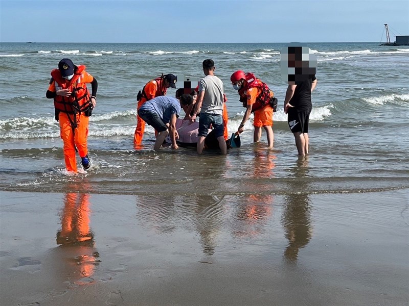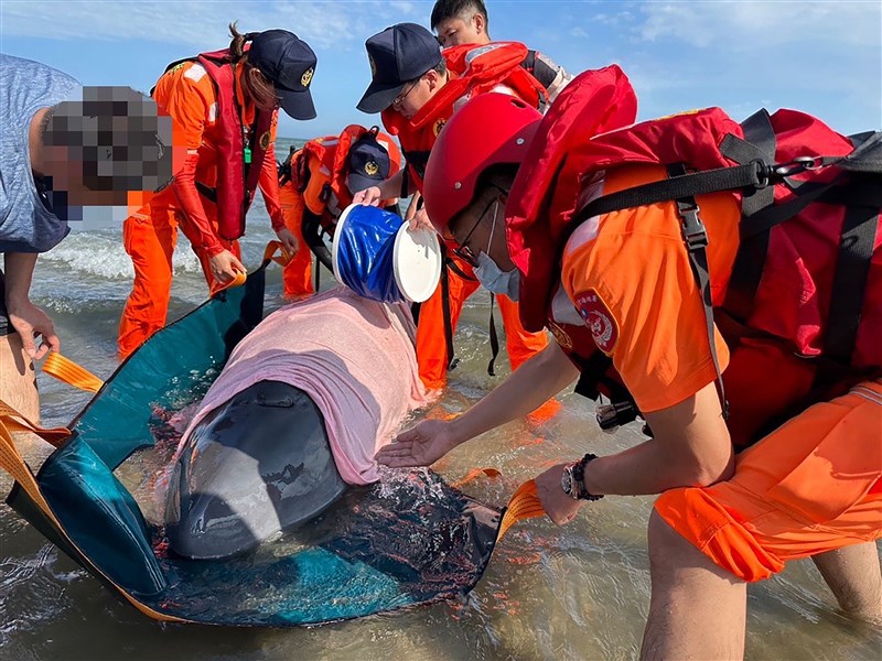 苗栗縣苑裡鎮出水里海灘,6日清晨發現一隻小抹香鯨擱淺,海巡人員和漁民合力搶救。圖/海巡署中部分署第三岸巡隊提供