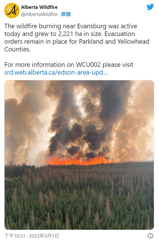 路透報導,截至當地時間昨天上午9時30分,共有2萬4511名居民被迫撤離家園。亞伯達省目前共有103處野火,覆蓋面積達到12萬1909公頃。