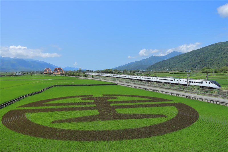 花蓮縣玉里鎮客城鐵橋北側翠綠稻田中,近期出現了大大的台鐵logo,民眾自即日起至6月中旬稻米收割前,都可自火車車窗飽覽玉里稻田彩繪美景。圖/台鐵提供