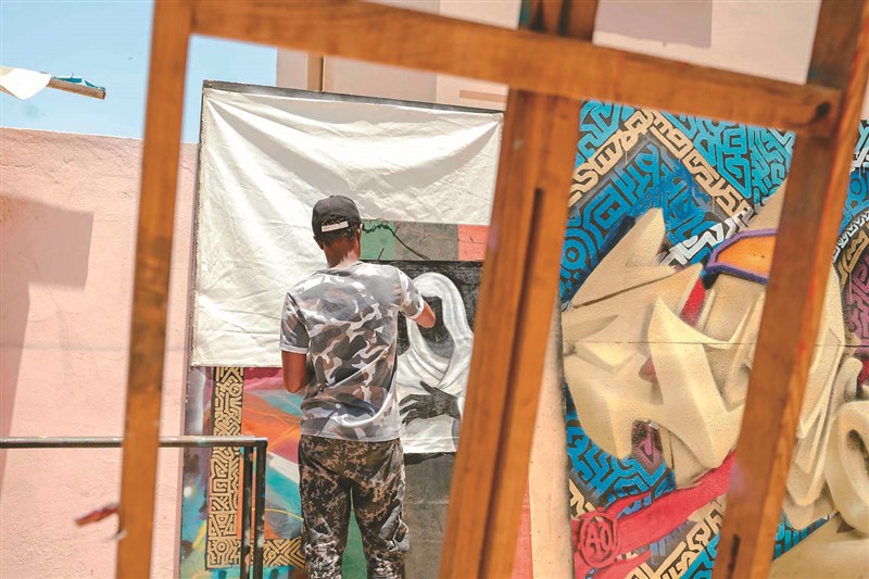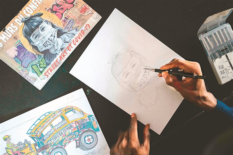 非洲塞內加爾首都達卡郊區RBS Akademya,是該國唯一1座塗鴉學校,為學生提供為期6個月的培訓課程,旨在幫助學生熟練技法。圖為1名藝術家4月26日在校內創作。圖/法新社