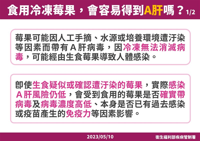 吃到A肝冷凍莓果染疫風險多高?羅一鈞說明,莓果通常是人工手摘處理,國外的栽種水源可能遭到病毒汙染,人工、環境水源都可能遭病毒汙染,冷凍過程沒有辦法消滅病毒,因此生食莓果確實有感染A肝風險,但機率低,國內事件至今,沒有任何一例A肝確定與莓果相關,食用到的莓果上面「病毒濃度高低」、「過去有無A肝感染史」、「曾施打A疫苗」都是影響因子。