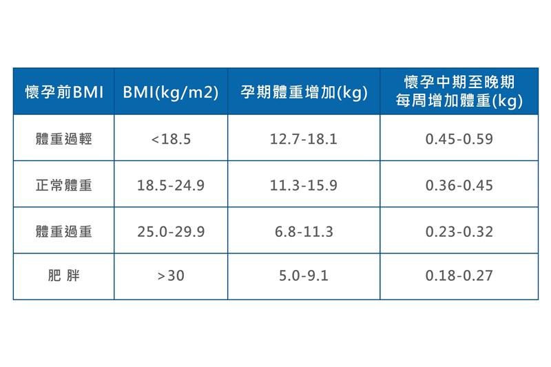 ACOG臨床實踐指南孕期增重建議表。圖/淨妍醫美診所提供