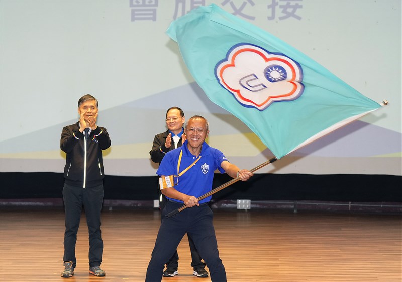 台體大許光麃校長(前排中)自中原大學李英明校長(後排左1)及體育署呂宏進主任秘書(後排中)手中接過113學年度全大運會旗後,振臂揮舞。圖/體育署提供