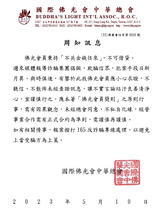 國際佛光會中華總會指出,邇來媒體報導詐騙集團猖獗,欺騙信眾,犯案手段日新月異、與時俱進,有鑑於此我佛光會員應小心求證,不聽信、不散佈未經查證訊息,讓不實言論玷汙良善清淨心,宜謹慎行之。