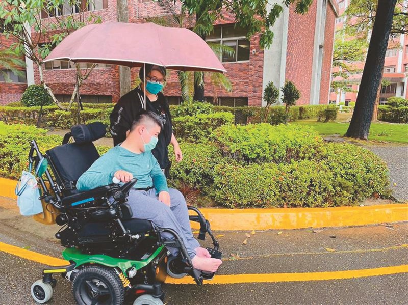 武旭丞上下學以輪椅代步,求學路上都由媽媽、外婆或阿姨陪伴。圖/中央社