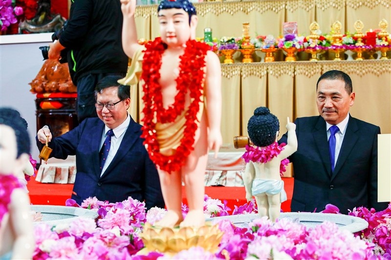 Vice Premier Cheng Wen-tsan(left) and New Taipei City Mayor Hou Yu-ih participated in the "Buddha's Birthday Bathing the Buddha Celebration" and bathed the Buddha. photo/The Life News Agency