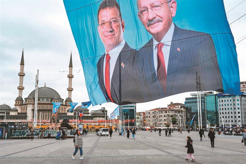 土耳其五月十四日舉行大選,伊斯坦堡可看見主要反對聯盟候選人庫魯奇達羅格魯(右)和伊斯坦堡市長伊瑪莫魯(左)合影的競選旗幟。圖/法新社