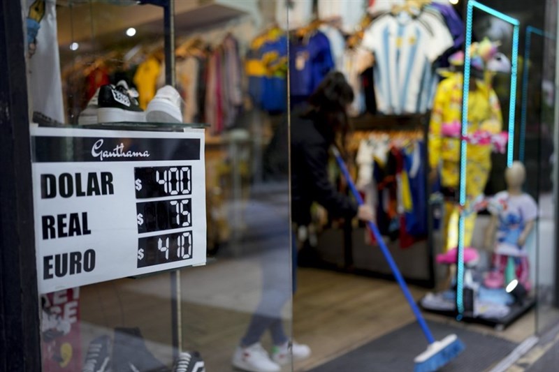 阿根廷商店門口貼著私人匯率。官方匯率為229披索兌1美元,店家提供的匯率為400披索兌1美元,將近兩倍。 圖/美聯社