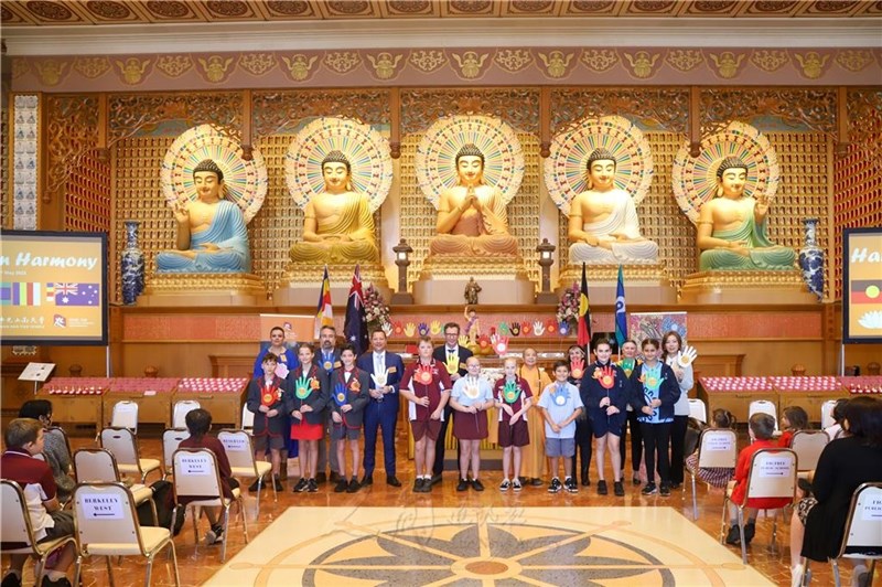 The honoured guest in attendance included Venerable Manke, Head Abbess of Fo Guang Shan Australia and New Zealand; Lord Mayor Gordon Bradbery AM of Wollongong; The Hon Stephen Jones MP, Assistant Treasurer Minister for Financial Services of Australian Federal Government; Paul Scully MP, Minister for Planning and Public Spaces in the New South Wales Government; Dr. Jodi Edward, Custodian of Dharawal Aboriginal Land; as well as approximately one hundred student representatives from Berkeley West, Figtree, and Unanderra public schools. Together, they witnessed the compassionate power of "Hands in Harmony" in promoting diversity and inclusivity.