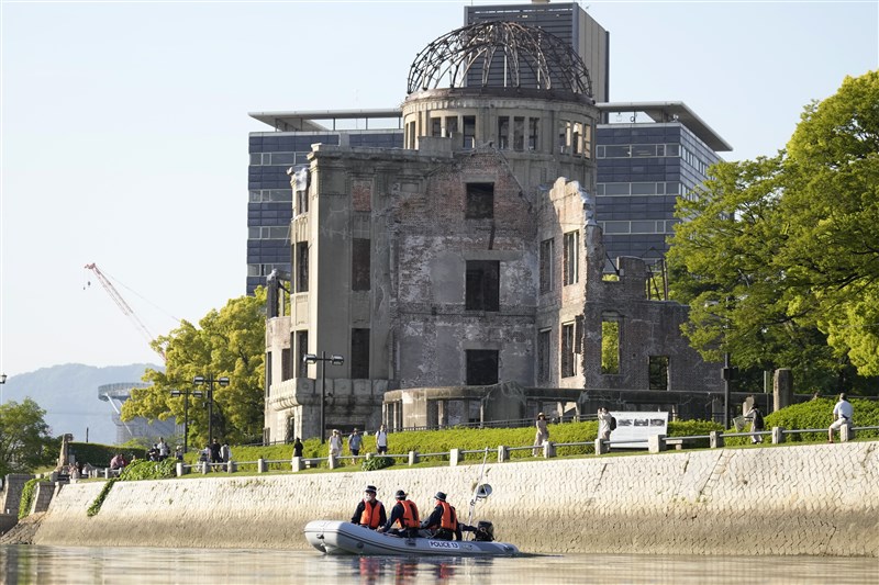 日本西部廣島舉行的G7會議之前,日本警察在著名的原子彈爆炸穹頂附近河上巡邏。圖/美聯社