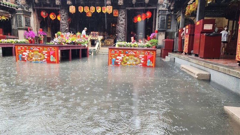 廟方人員表示,上次淹水是廟埕、太歲廳等處,今天則是擺置供桌的丹墀位置淹水,持續抽水排除,由於今天雨勢不比上次又急又猛,因此廟埕沒淹水,據了解鹿港老街也沒嚴重積水,不過今年起丹墀位置遇雨就淹,隨雨勢淹得快或慢,可能排水管線堵塞將查修。
