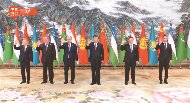 「中國─中亞峰會」於5月18、19日在陝西省西安舉行,中國大陸國家主席習近平(中)與出席的中亞五國領袖哈薩克總統托卡葉夫(Kassym-Jomart Tokayev)(左三)、吉爾吉斯總統賈帕洛夫 (Sadyr Japarov)(右二)、塔吉克總統拉赫莫(Emomali Rahmon)(左二)、土庫曼總統塞達爾(Serdar Berdymukhamedov)(右)和烏茲別克總統米爾濟約耶夫(Shavkat Mirziyoyev)(左)合影留念。圖/取自央視