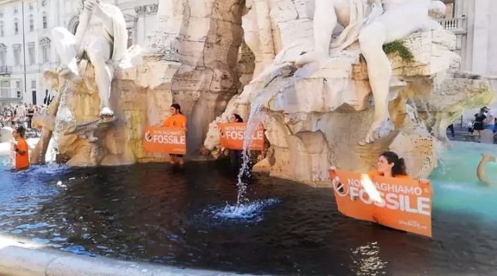 綜合法新社與路透社報導,來自反氣候變遷組織「最後一代」(Ultima Generazione)的7名青年,舉著「我們不會為化石(燃料)買單」的標語,高喊著「我們的國家正在死亡」,爬進這座羅馬著名的噴泉倒入黑色植物炭液體,警察後來將他們強行請走。