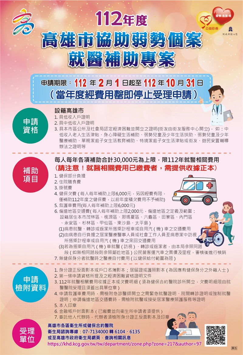高市府衛生局指出,每年本補助經分析民眾主要申請項目為健保部分負擔費及住院膳食費,另掛號費、救護車費用等均可申請補助;民眾如經高雄市區公所及社會局認定經濟困難並開立證明,持今年度於健保特約醫療院所就醫之醫療收據正本及相關申辦文件,前往當地衛生所提出申請就醫補助。倘係於健保特約醫院就醫欠費,可逕自向就醫醫院社工室提出申請。