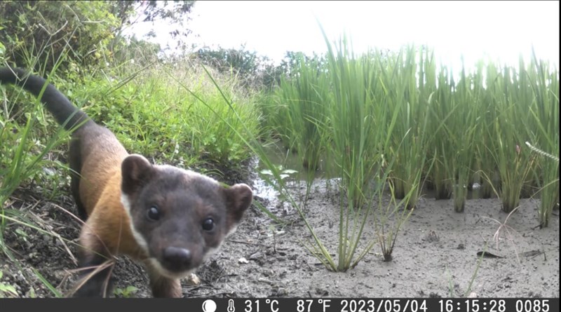台東池上青年培力工作站紀錄生態資料1000多筆,日前拍攝到黃喉貂,生態顧問公司執行長林耿弘指出,這應是全台灣第一次在水稻田記錄到。圖/熊良心生態顧問公司提供