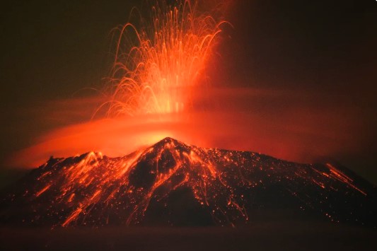 墨西哥煙峰火山(Popocatepetl volcano)的濃煙、火山灰和熔岩噴向天際。圖/法新社
